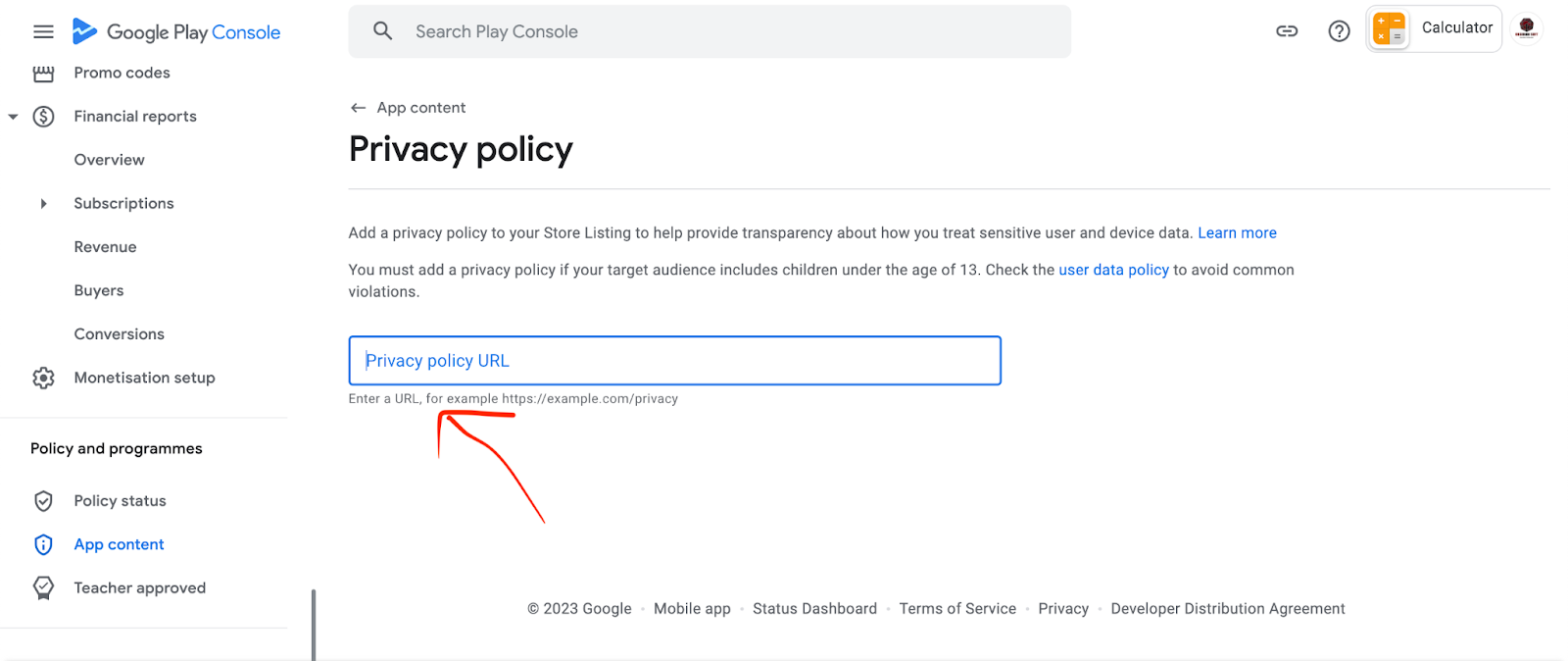 Click on the privacy policy on your site. Copy the link from your browser. Now, paste this link into the app content section of your app in the Google Play console.