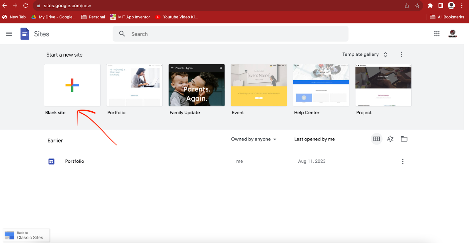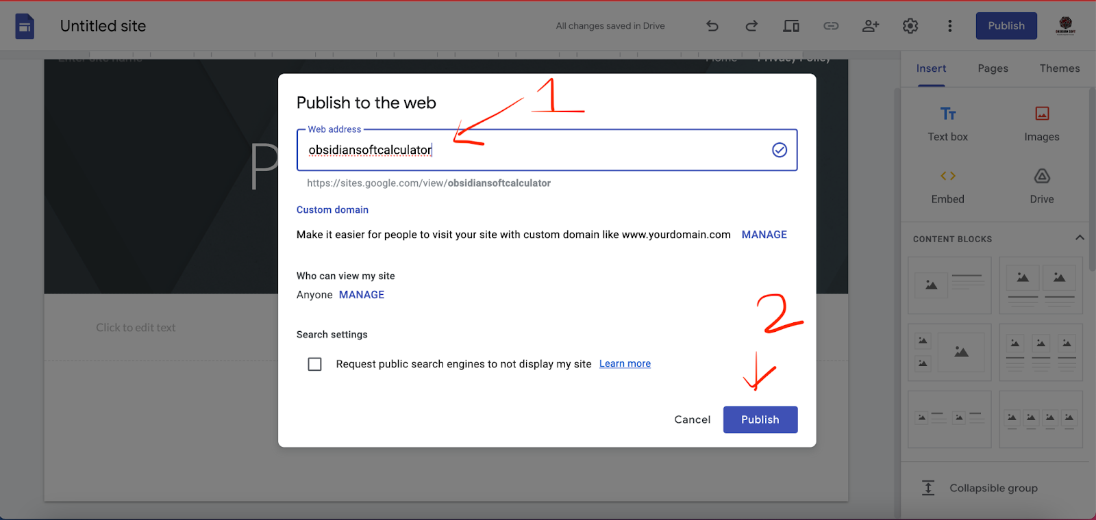 Give a unique site name and press on publish. Your new website’s address is http://sites.google.com/view/