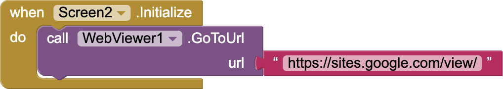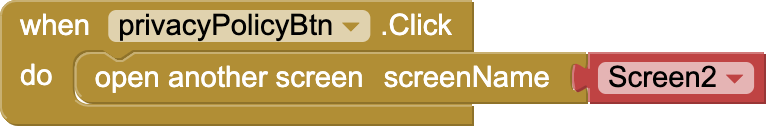 Now, go to the blocks section of screen 2 and get its initialize event. Use webviewer’s GotoURL procedure and paste the link of your app’s privacy policy in a text block.