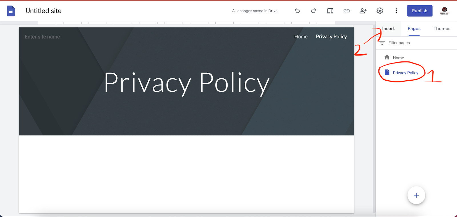 Now, while you have the privacy policy page selected, click on Insert.