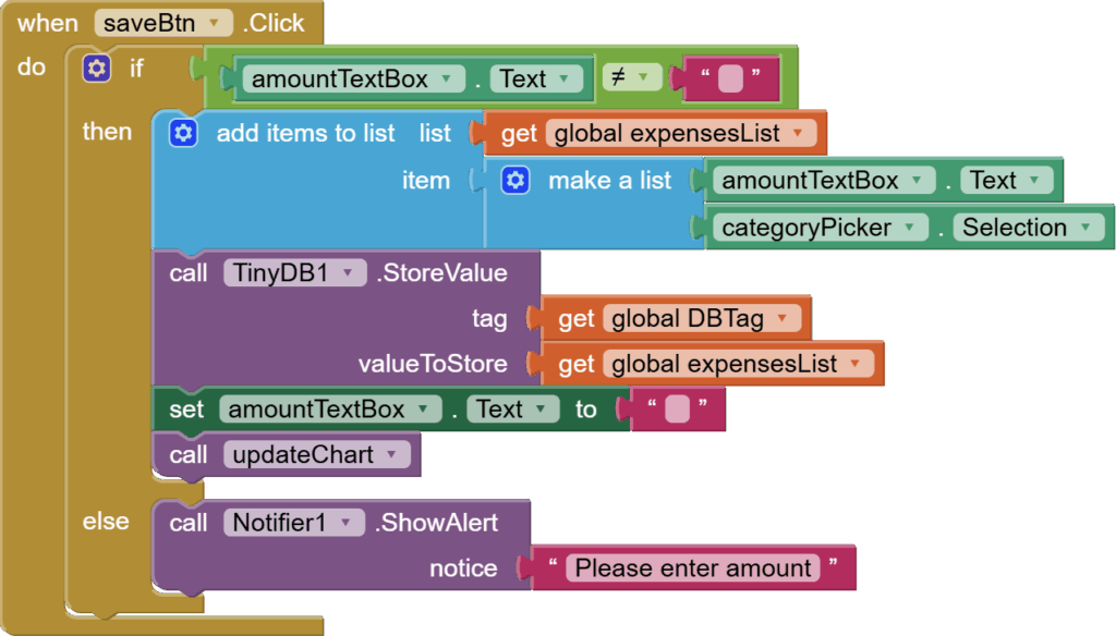 Next, we need to store this expensesList in TinyDB against our DBTag. We will also empty our amountTexbox to prepare for future entries and call our updateChart procedure(empty at the moment)