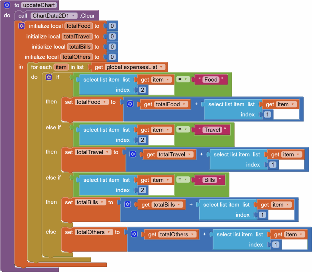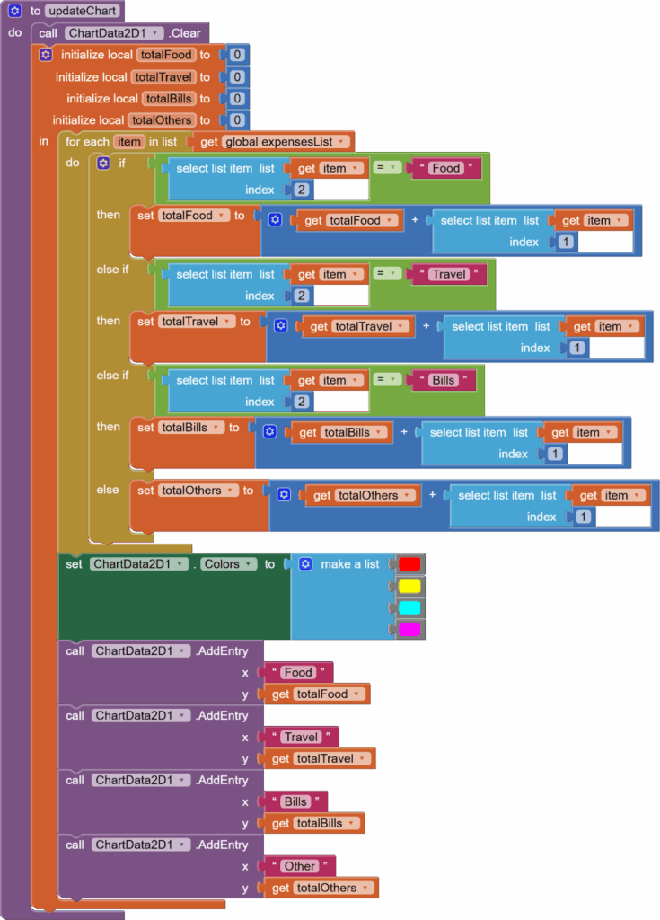 Next, what happens when the screen is initialized? We need to load our previously saved expenses list from the tinyDB against our DB tag into our global expenses list and construct the pie chart for it by calling updateChart procedure.
