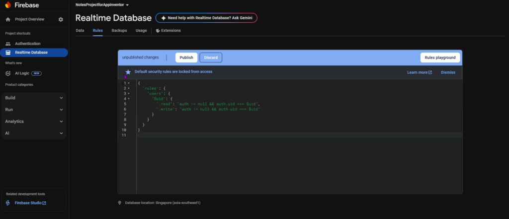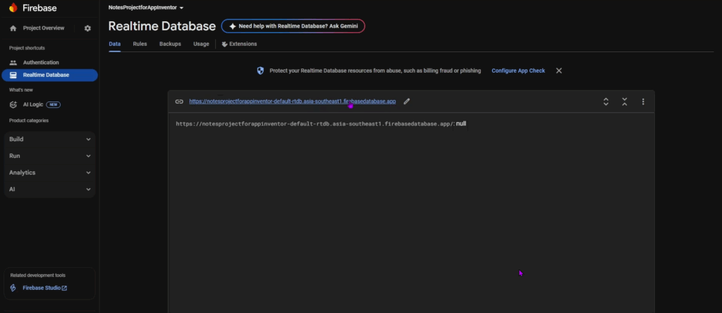 Then, click on ‘Create Database’ button and choose the location nearest to you. For example, I chose Singapore. And then start the database in locked mode. Now, you can see the difference. For the Firebase DB component in our earlier tutorials, we started in test mode, and we kept the project in that mode, which was unsafe, as anyone could see our data if they had the link. Locked mode means no one can read/write to our database. After the database is created, you will see the reference URL to your database.