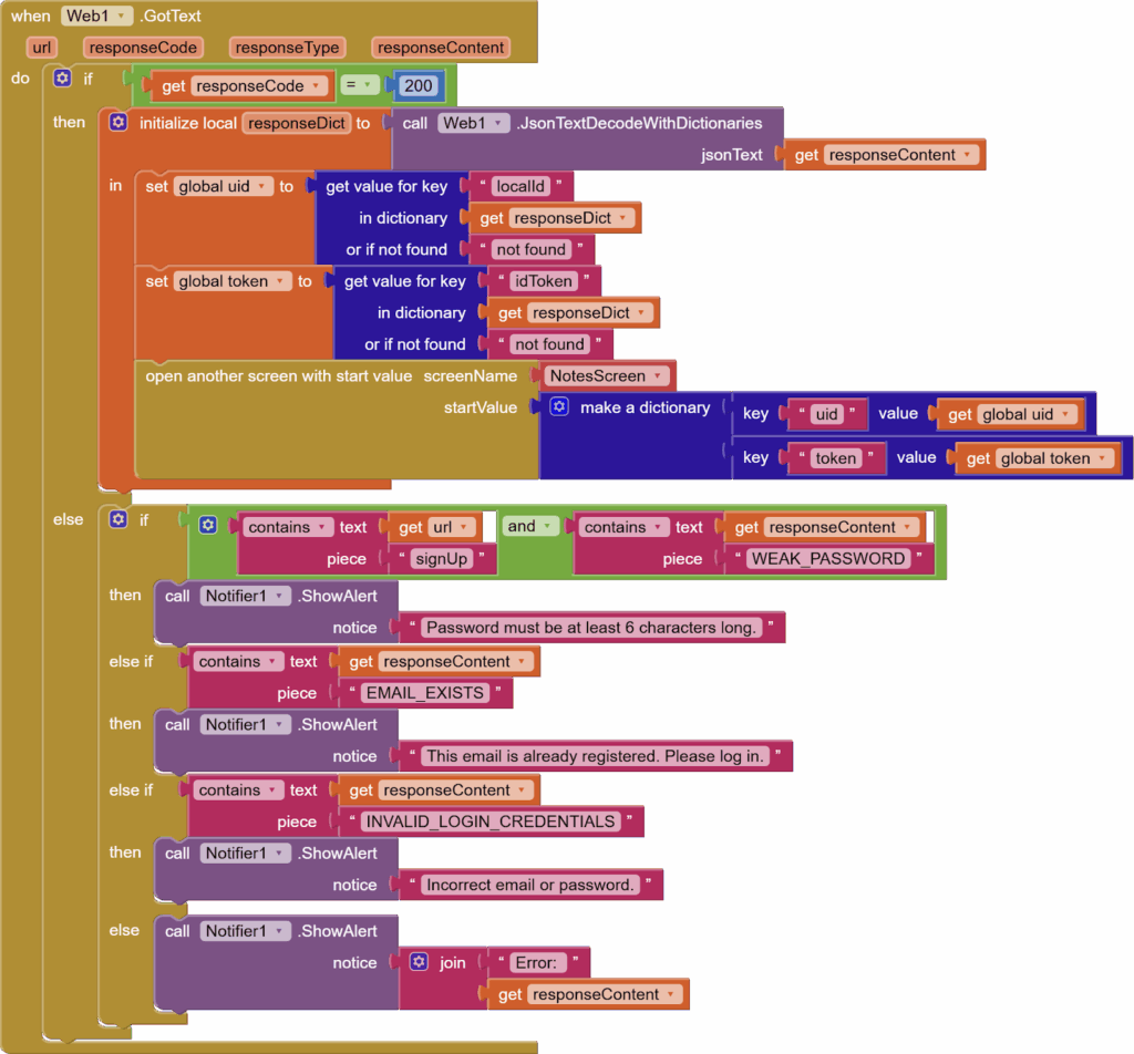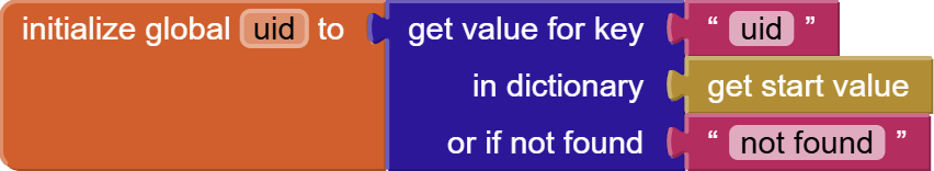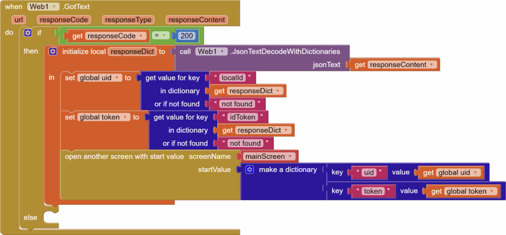 We are interested in two things. The localId and the idToken (spellings and case are both important here). We are going to use Dictionary’s getValue for the Key block to get these values by specifying exact keys and store them in our global variables uid and token, respectively. And we will open the second screen, passing these values in a dictionary.
