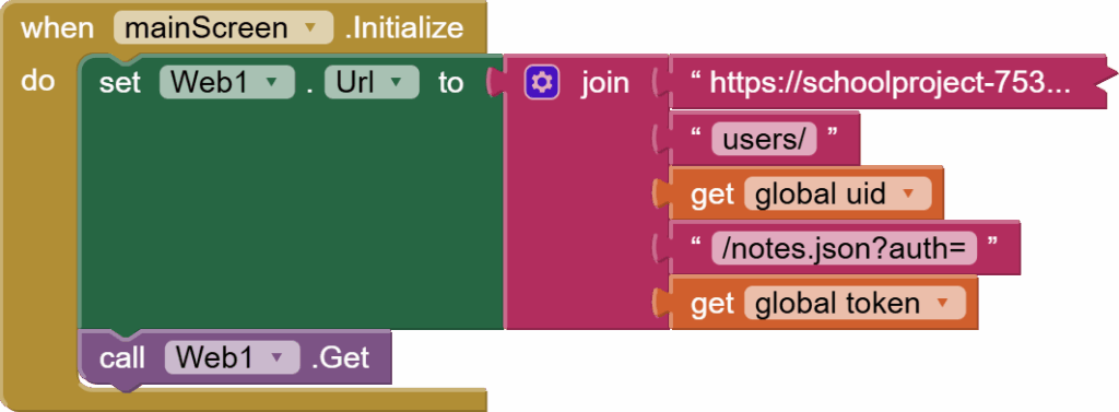 The web1.get will trigger the gotText event, but before working on that, let’s work on our saveBtn code. We check that the note’s text isn’t empty, and then we set exactly the same URL as we used in the screen’s initialize event, so duplicate from there.
