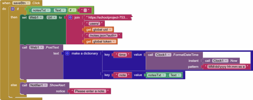 Then we make a dictionary of two things: clock.now and notesTxt.text against their respective keys of “time” and “note”. And we post this as text to the Web. In the else, we show an alert that enter a value for the note.