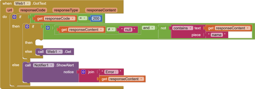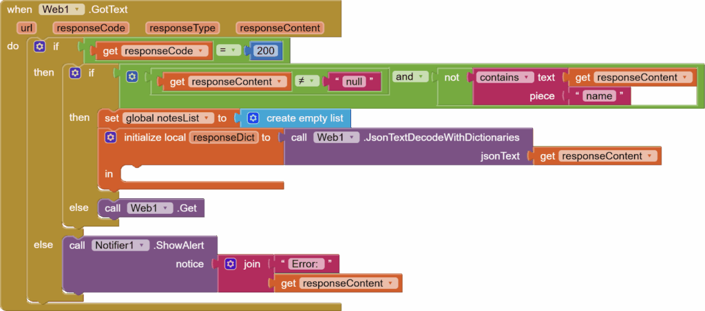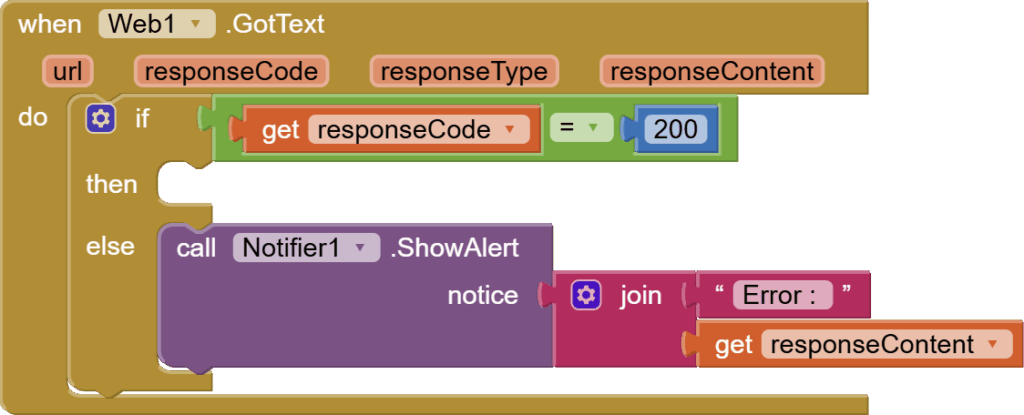 The postText also triggers the Web’s gotText event, so now, let’s finally work on our final event, i.e., the Web’s gotText event. First, we check that we got a successful response from the server. If not, we show the error using the notifier’s show alert block.
