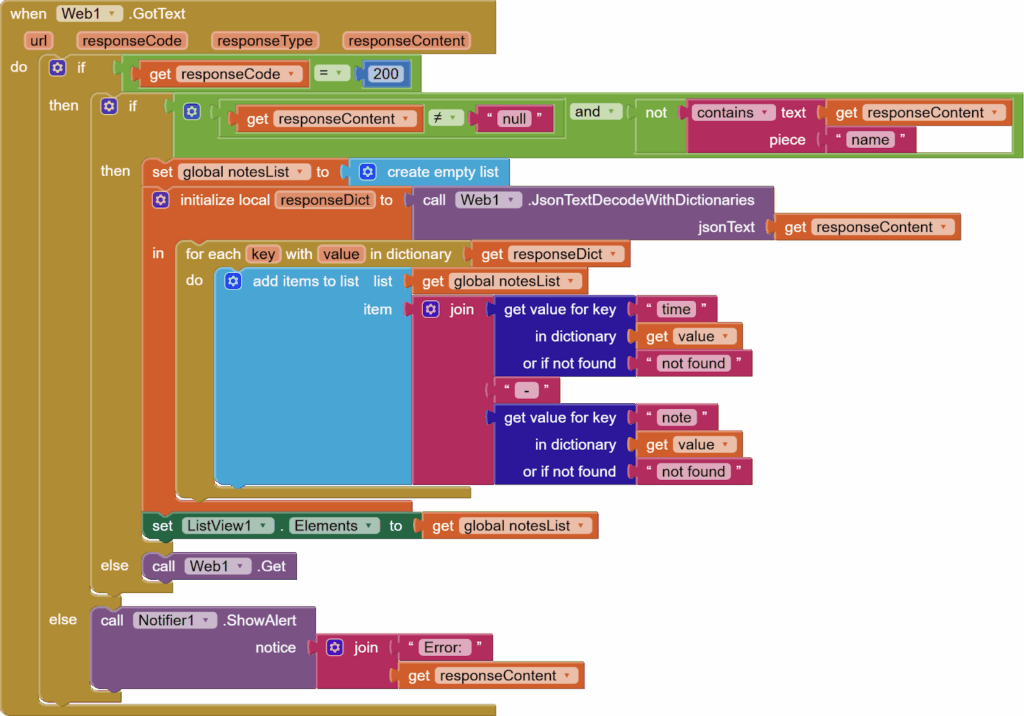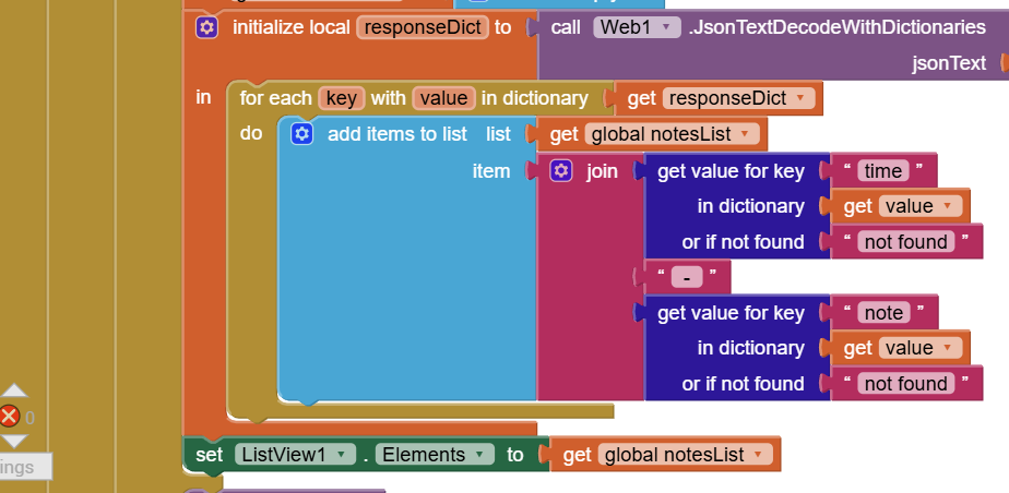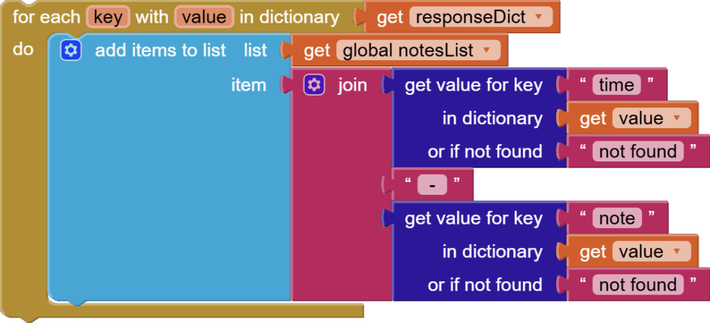 We can get all these “note dictionaries” by using a for each key with value block from Control to go through our responseDictionary. Here each value is a “note dictionary” with two key value pairs. We get these values and join them with a “ – “ in between to make a display string or text and we add it to our notes list.