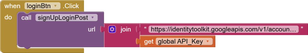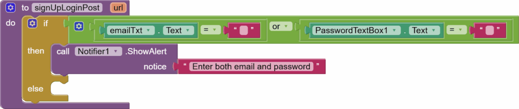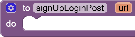 Our sign-up and log-in procedures are almost identical except for the web URL, so it is best to make a procedure. Hence, go to the Procedures section on the left and get the first type of block. Rename to signUpLoginPost. Click on the cog wheel to add an input parameter called url.