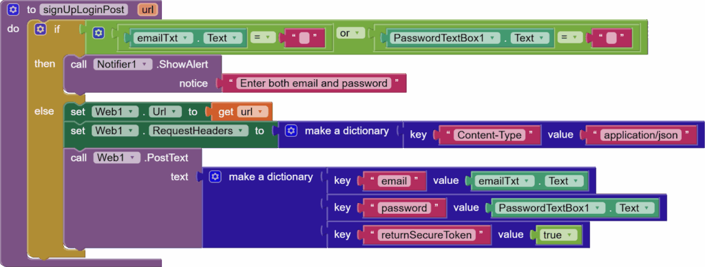 We provide the input URL to the web’s URL property. We set the Web’s request headers to a dictionary with key: “Content-Type” and value: “application/json”. And then we send the user-entered data as a dictionary to the Firebase authentication system with returnSecureToken set to true. Please do it the same way, as the spellings of the keys are super important.