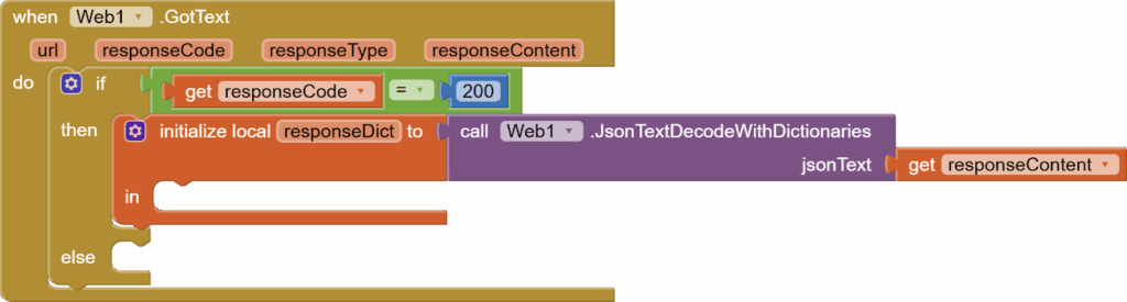 Again, because of error handling, we need an IF/ELSE block from Control. In IF, we first check that the response code is equal to 200. This is the standard web response for a successful request. If successful, we are going to decode our response content into a dictionary called responseDict.