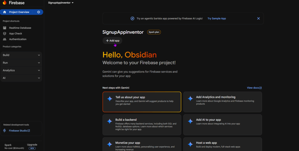 Now, we also need a database in this project, so click on Realtime Database on the left again under the build tab.
