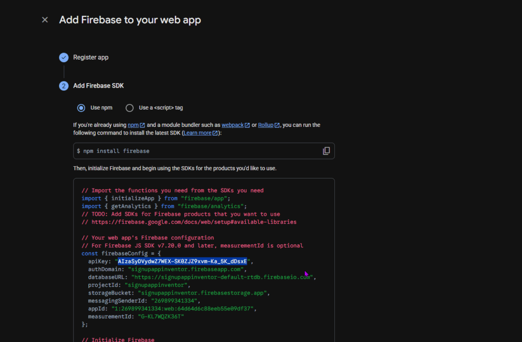After a few seconds, some details will show up. Copy the apiKey. This is your Web API key.
