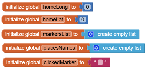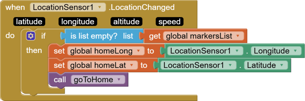 Next, get the LocationChanged event of the location sensor. Check if the map doesn’t already have markers, as this means the home was already set. If the list of markers is empty, then set global variables for home latitude and longitude to the latitude and longitude detected by the location sensor, and then call goToHome procedure.