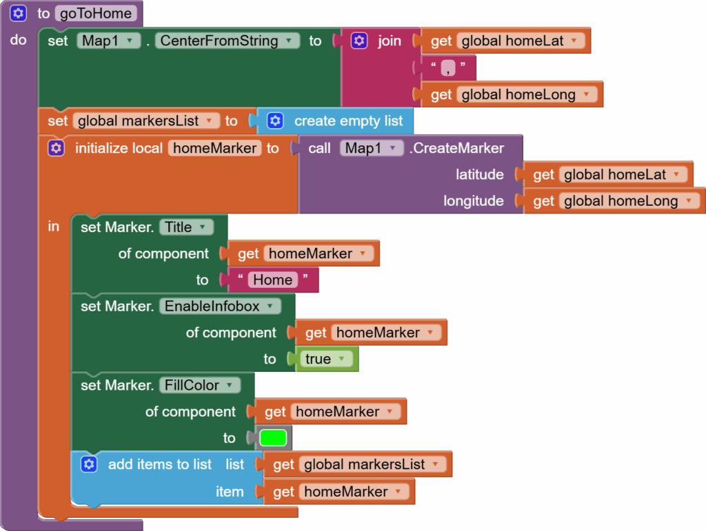 Now, let’s work on the goToHome procedure. First, we center themap around our home’s latitude and longitude. Then, we empty our markers list. This goToHome will be called at two points: when our location is determined for the first time, and when we choose some other amenity in the places list picker.