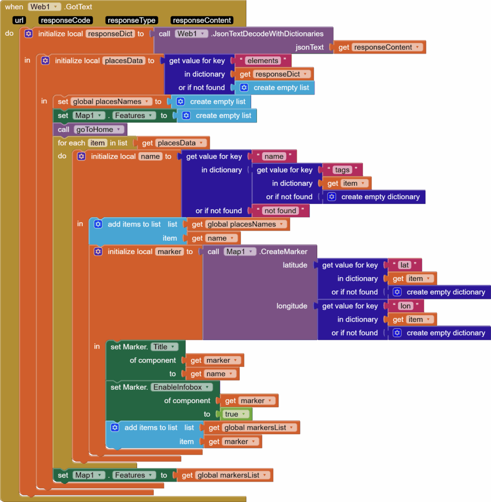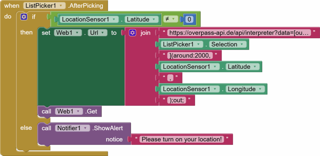 When the user chooses an amenity or place, the list picker’s AfterPicking event is triggered.First, we check if the location sensor’s latitude isn’t 0. This means that the user hasn’t turned on their location. So, use the notifier to show a relevant message in the else. In If, set the web component’s URL to a call to the Overpass API, which is a way of accessing OpenStreetMap data.