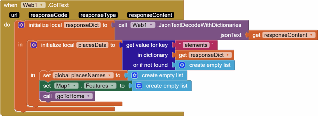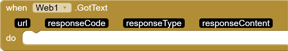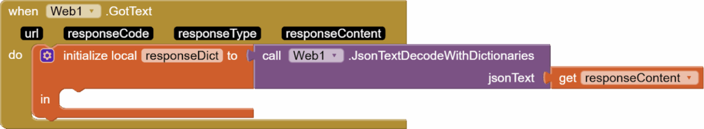 Then, call web1. Get. Verify the blocks in ListPicker.AfterPicking event super carefully as a small spelling mistake can lead to the API call failing. Your block structure should look like the following: