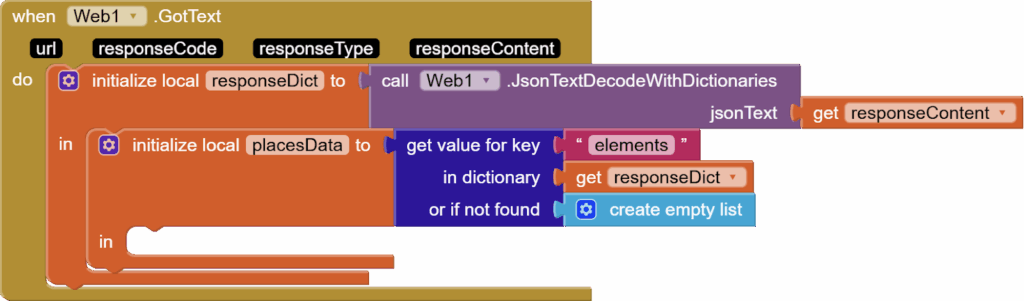 And we need the list of places inside this responseDict against the key: “elements”. Spelling is very important when getting data from dictionaries. We will put all places inside a local list of placesData.