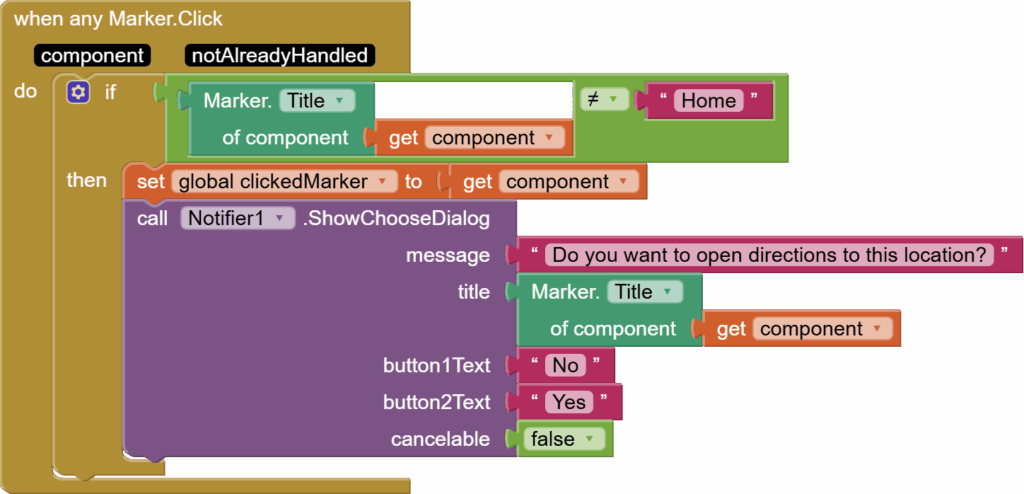 Since we have so many markers, here, any component blocks are super helpful in coding. We get the any Marker click event. We check that the marker’s title isn’t Home. And then, we store this marker in the global clickedMarker variable. And we show a dialog user Notifier’s ShowChooseDialog asking whether the user wants to open Google Maps to show directions.