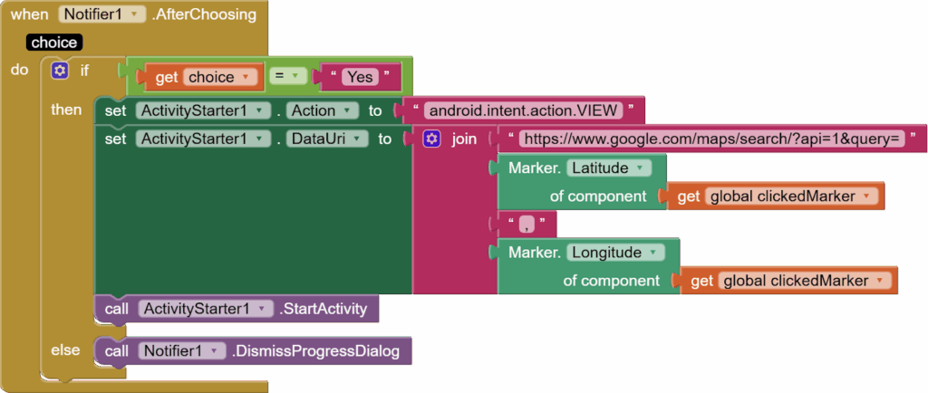 When the user chooses something on the dialog: yes or no button, Notifier’s After Choosing event is triggered. If their choice is yes, we will open up Google Maps using the activity starter; otherwise, we will dismiss the dialog.
