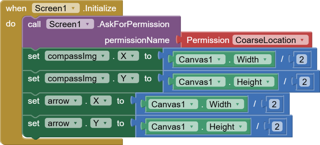 We are giving invalid values to user longitude and latitude so that we are able to distinguish when actual values are available. The longitude can’t be more than 180 and the latitude cannot be more than 90. When the screen is initialized, we need to ask for location permission so get askForPermission block from screen1 and choose course location.