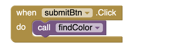 Now make a procedure findColor that uses the color hex provided by the user to search through our list of dictionary objects to find the color name.