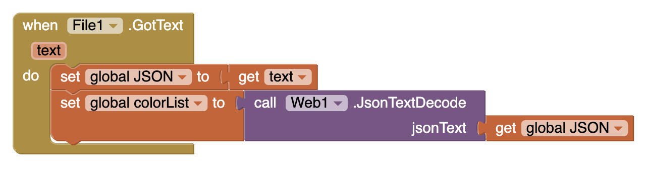Make sure that spellings are correct. After two forward slashes (//), write the name of the file as it has been imported into the project: it shouldn’t have any white spaces. After the file has been loaded successfully, File’s GotText event will be triggered. Decode JSON using Web component’s procedure and put it inside colorList global variable because remember that the end result after decoding will be a list as our JSON file started with a square bracket.